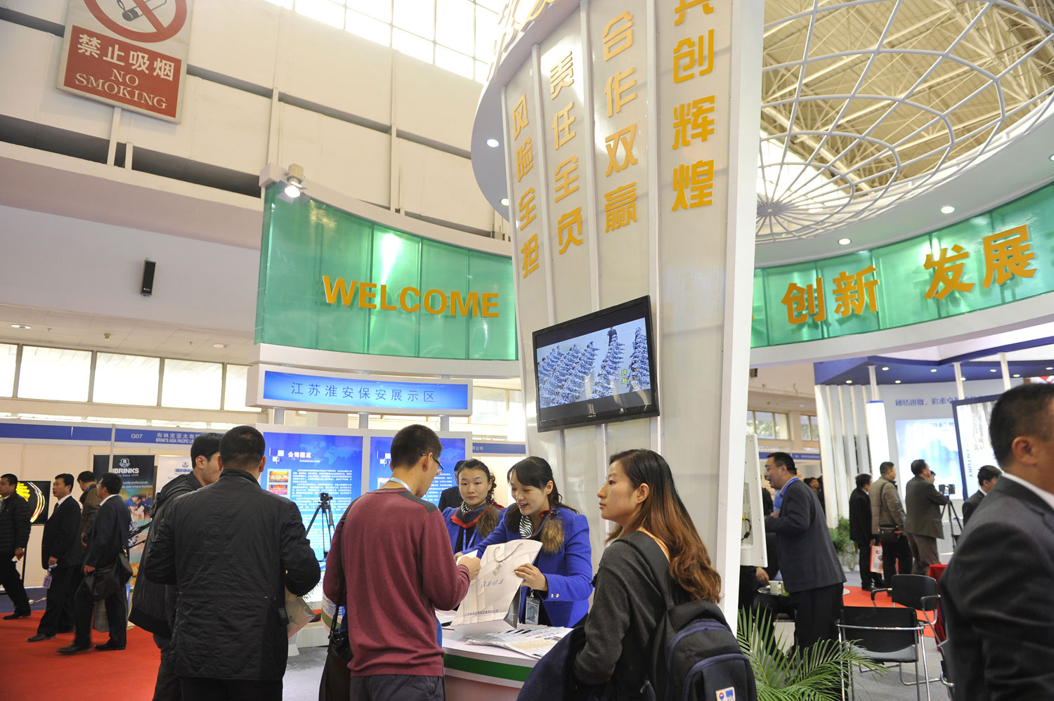 總公司在這次展會(huì)上首次參展亮相,采取多種方式來(lái)展示淮安保安品牌:一是認(rèn)真確定了展位面積和位置,以及新穎、獨(dú)特、大氣的展位設(shè)計(jì);二是制作了圖文并茂并有特色亮點(diǎn)的宣傳展示燈箱,推出跨國(guó)保安服務(wù)、一站式保安服務(wù)和自行研發(fā)的運(yùn)鈔車(chē)圖像傳輸系統(tǒng)等獨(dú)特實(shí)用的亮點(diǎn)項(xiàng)目;三是專(zhuān)業(yè)、標(biāo)準(zhǔn)、靚麗的禮儀接待服務(wù)。做到服務(wù)有形象,展示有內(nèi)容。四是在展會(huì)期間,我們分四批組織了公司人防、押運(yùn)等部門(mén)50余名骨干來(lái)京觀展,向同行學(xué)經(jīng)驗(yàn),向優(yōu)秀企業(yè)學(xué)管理。