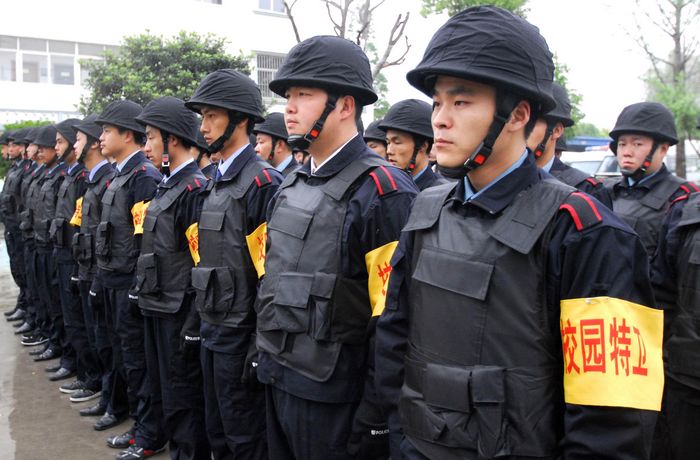 2010年5月5日早晨6時(shí)許,全副武裝的校園特衛(wèi)人員整裝待發(fā)。自當(dāng)日起,江蘇省淮安市首批46名配備鋼盔、防刺服、防割手套、防暴膠棒、滅火槍、催淚器等防護(hù)裝備的專職校園特衛(wèi)人員開始進(jìn)駐市直23所中小學(xué)和幼兒園,守護(hù)校園平安。這些人員都是從全市保安隊(duì)伍中精選出來的骨干,年齡在35歲以下,大都有部隊(duì)服役的經(jīng)歷,身體素質(zhì)和政治素質(zhì)較好,且受過專業(yè)訓(xùn)練。