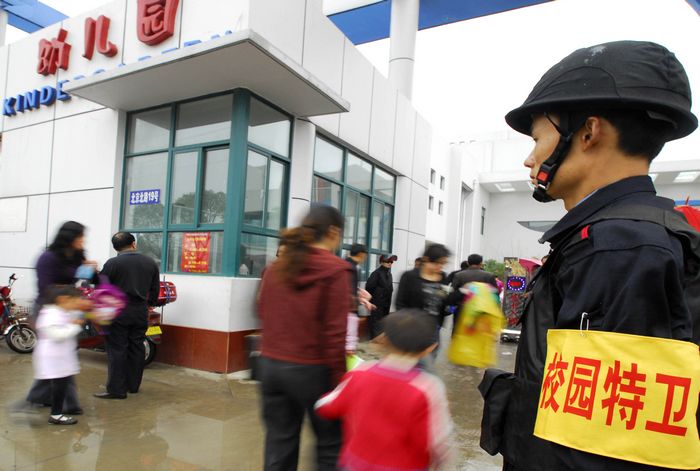 名配備鋼盔、防刺服、防割手套、防暴膠棒、滅火槍、催淚器等防護裝備的專職校園特衛(wèi)人員開始進駐市直