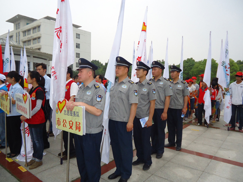 早上8:30左右 , 隊(duì)員們統(tǒng)一制服,帶上隊(duì)旗和隊(duì)牌,在師范學(xué)院王營(yíng)校區(qū)生物科學(xué)館前廣場(chǎng)前參加環(huán)保知識(shí)的宣傳活動(dòng)。隊(duì)員們紛紛表示,保護(hù)環(huán)境,與我們的生活息息相關(guān),從身邊小事做起,將切實(shí)落實(shí)到保安的實(shí)際工作中去。作為青年志愿者,將呼吁身邊更多的人用實(shí)際行動(dòng),共同為保護(hù)洪澤湖、保護(hù)環(huán)境而盡心盡力,為努力營(yíng)造一個(gè)優(yōu)美的人居環(huán)境而努力。