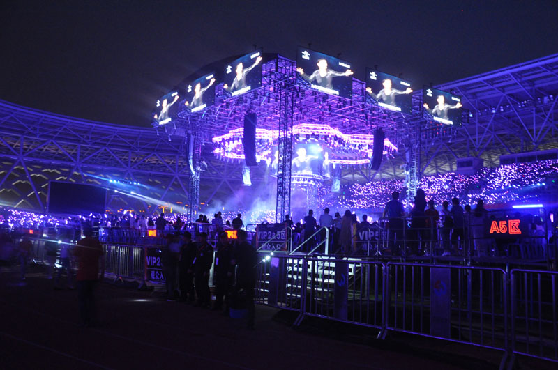 5月5日,“A CLASSIC TOUR學(xué)友·經(jīng)典世界演唱會(huì)”揚(yáng)州站,以人防中心王錦春總監(jiān)為領(lǐng)導(dǎo)管理班子,積極與主辦方聯(lián)絡(luò),在演唱會(huì)前一天,組織精干管理人員踏勘現(xiàn)場(chǎng),提出合理化安保建議,精心組織崗位分配,各項(xiàng)前期準(zhǔn)備工作有條不紊地開(kāi)展。5日上午10時(shí),第一批100名大型活動(dòng)特勤安保隊(duì)伍進(jìn)駐揚(yáng)州體育公園,下午16時(shí),100名專(zhuān)業(yè)安檢員和特勤隊(duì)員準(zhǔn)時(shí)到達(dá)各預(yù)定崗位開(kāi)展工作。在整場(chǎng)演唱會(huì)活動(dòng)中,安檢崗位中查獲各類(lèi)違禁品5000余件。因主辦方設(shè)定預(yù)檢票口位置較少,造成大量觀眾聚集,我們合理調(diào)集機(jī)動(dòng)隊(duì)伍認(rèn)真做好人員疏散工作,避免了事故隱患。