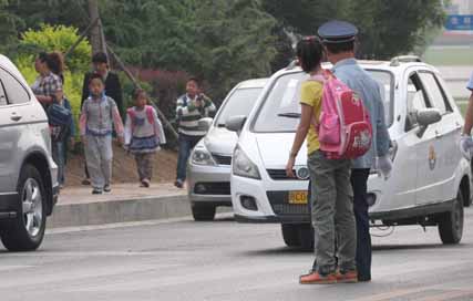 7時(shí)26分,路上的車(chē)流較之前明顯多了起來(lái),一位正準(zhǔn)備過(guò)馬路的女孩則直接向?qū)γ娴谋0舱惺郑0部吹竭@種情況后,急忙趕來(lái)把她接進(jìn)了校園。
