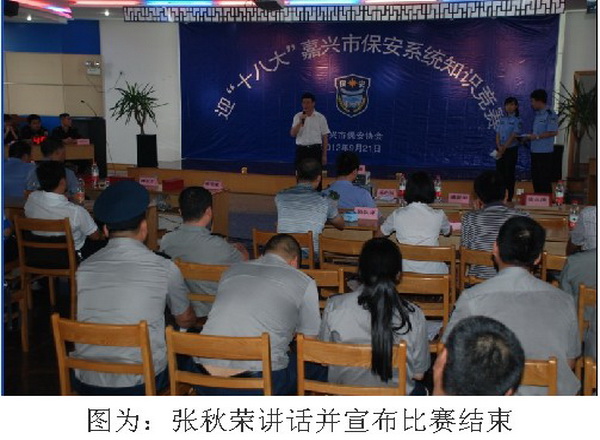 浙江省保安工作消息 為迎接黨的“十八大”順利召開,9月21日下午,浙江省嘉興市保安協(xié)會在嘉興市公安局人民警察培訓學校舉辦了全市“保安系統(tǒng)知識競賽”。省公安廳治安總隊保安科科長、省保安協(xié)會秘書長傅志方,省公安廳治安總隊保安科壽俊杰,市保安協(xié)會常務副會長兼秘書長張秋榮,市保安服務公司總經(jīng)理、市保安協(xié)會副會長皇甫玉明等領導蒞臨現(xiàn)場觀摩指導。嘉興市公安局治安支隊政委潘新華和治安支隊副支隊長朱忠華分別致了比賽開幕詞和閉幕詞。由市局特警支隊政委陸永清等四人組成的評委團對比賽全程進行了監(jiān)督、評判。
