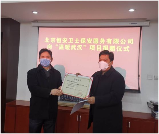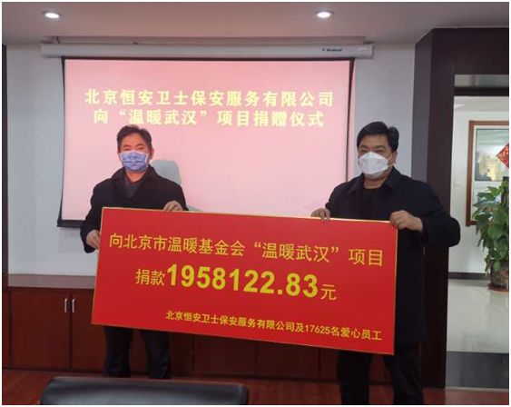 2020年3月9日,北京恒安衛(wèi)士保安服務(wù)有限公司將企業(yè)和17625名愛(ài)心員工共計(jì)1958122.83元的善款捐贈(zèng)至北京市溫暖基金會(huì),通過(guò)溫暖基金會(huì)表達(dá)對(duì)武漢市抗疫一線醫(yī)務(wù)工作者、公安干警和保安兄弟的崇高敬意。