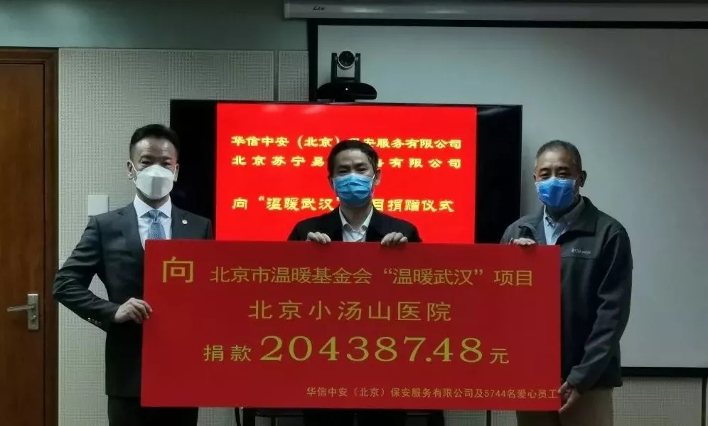 2020年4月15日上午10時,華信中安(北京)保安服務(wù)有限公司向“溫暖武漢”項目善款捐贈儀式在北京市醫(yī)院管理局辦公樓舉行。北京市總工會黨組成員、副主席蔣文云;北京市總工會政法衛(wèi)文工會主席張樹坡;北京市溫暖基金會黨支部書記郭建強;北京市保安服務(wù)行業(yè)工會聯(lián)合會陳剛;北京市醫(yī)院管理中心副巡視員徐長順;北京市醫(yī)院管理中心工會專職副主席趙紅;北京小湯山醫(yī)院黨委書記、小湯山定點醫(yī)院臨時黨委委員、工作專班副組長許峻峰;華信中安集團董事長殷衛(wèi)宏出席捐贈儀式。捐贈儀式由北京市溫暖基金會黨支部書記郭建強主持召開。