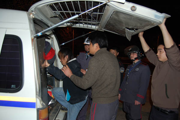 (圖為處警人員將三賊扭送派出所)