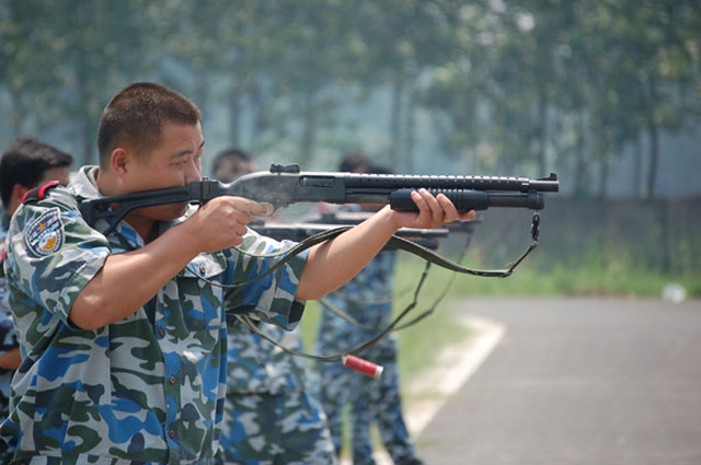 7月29日,一名武裝押運(yùn)員正在打靶,一枚彈殼從其槍中彈出,子彈應(yīng)聲中靶。當(dāng)日,淮安市保安服務(wù)總公司組織130名武裝押運(yùn)員進(jìn)行實(shí)彈打靶,開展練兵活動(dòng)。