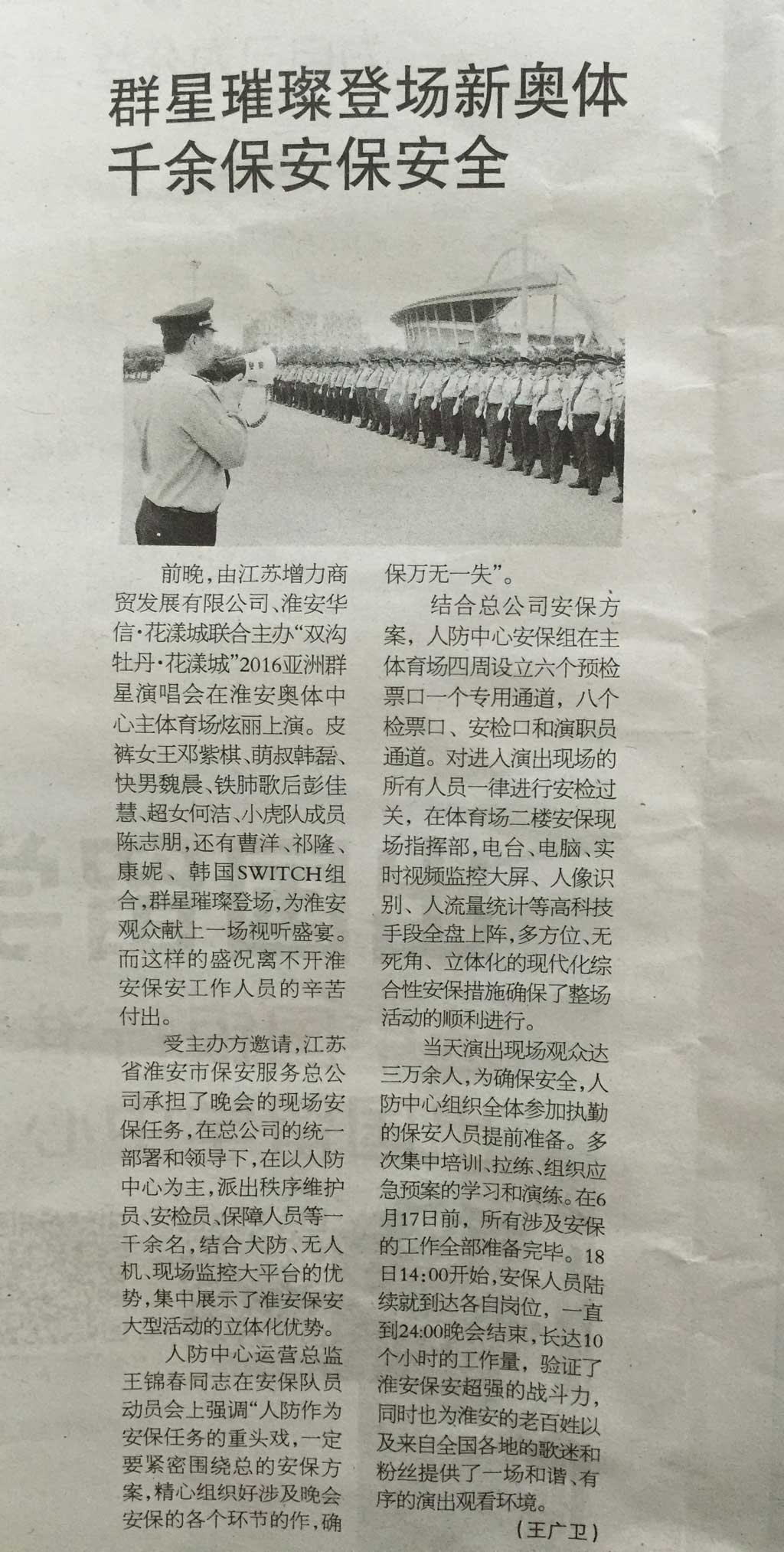 由江蘇增力商貿(mào)發(fā)展有限公司、淮安華信·花漾城聯(lián)合主辦“雙溝牡丹·花漾城”2016亞洲群星演唱會(huì)于6月18日晚上在淮安奧體中心主體育場炫麗上演。受主辦方邀請(qǐng),我公司承擔(dān)了晚會(huì)的現(xiàn)場安保任務(wù)。當(dāng)天現(xiàn)場觀眾達(dá)三萬余人,為確保安全,在總公司的統(tǒng)一部署和領(lǐng)導(dǎo)下,派出了秩序維護(hù)員、安檢員、保障人員等一千余名的強(qiáng)大陣容,同時(shí)結(jié)合犬防、無人機(jī)、現(xiàn)場監(jiān)控大屏等優(yōu)勢,集中展示了淮安保安大型活動(dòng)的綜合立體化優(yōu)勢和超強(qiáng)的戰(zhàn)斗力,受到了社會(huì)各界的充分肯定和高度評(píng)價(jià),并于2016年6月21日在《淮海晚報(bào)》上以“群星璀璨登場新奧體,千余保安保安全”為題予以宣傳報(bào)道。