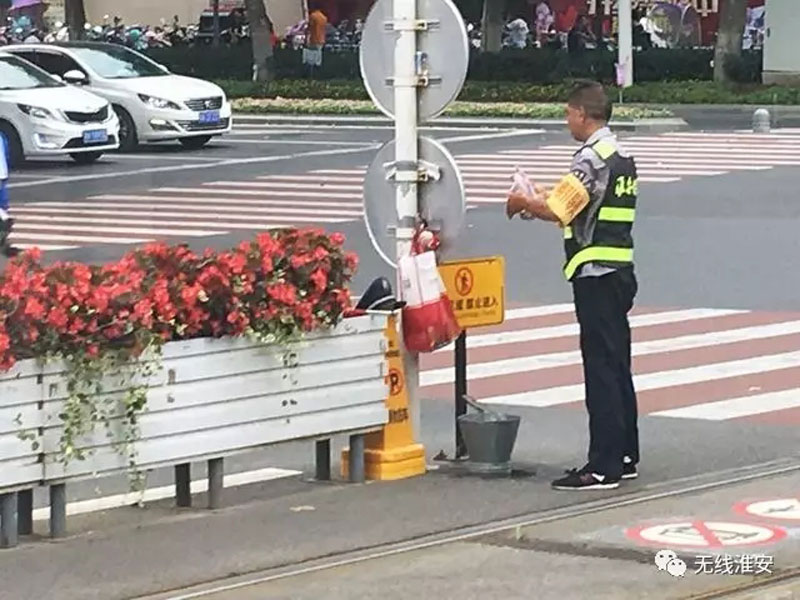 照片中,一位有軌電車(chē)保安隊(duì)員在酷暑中堅(jiān)守崗位,他的腳邊放著一只小鐵桶,執(zhí)勤過(guò)程中實(shí)在熱了,他就用毛巾擰一把擦汗降溫。市民周先生被這一幕深深感動(dòng),遠(yuǎn)遠(yuǎn)的拍下了幾張照片。