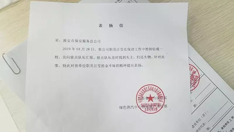 2019年5月1日,駐外分公司收到來(lái)自中國(guó)能源建設(shè)集團(tuán)江蘇省電力設(shè)計(jì)院有限公司發(fā)來(lái)的表?yè)P(yáng)信,感謝淮安保安駐江蘇省電力設(shè)計(jì)院有限公司隊(duì)員汪瑩在4月28日的保潔工作中拾金不昧,撿到鉆戒后立即向隊(duì)長(zhǎng)匯報(bào),駐點(diǎn)隊(duì)長(zhǎng)及時(shí)通報(bào)客戶(hù)單位并采取相應(yīng)措施聯(lián)系到失主,歸還失物。失主非常感謝汪瑩,客戶(hù)單位對(duì)淮安保安派駐的保潔員汪瑩同志拾金不昧的精神提出了表?yè)P(yáng),對(duì)淮安保安進(jìn)駐后的工作也表示認(rèn)可!
