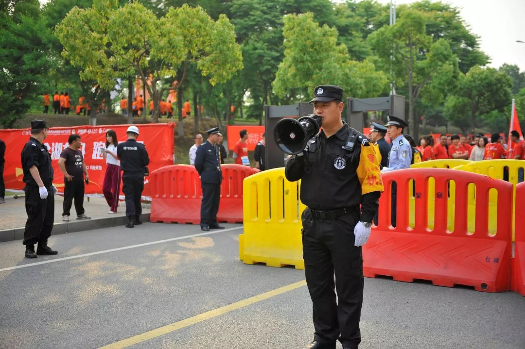 執(zhí)勤隊(duì)員手持喊話器維持現(xiàn)場(chǎng)安全秩序
