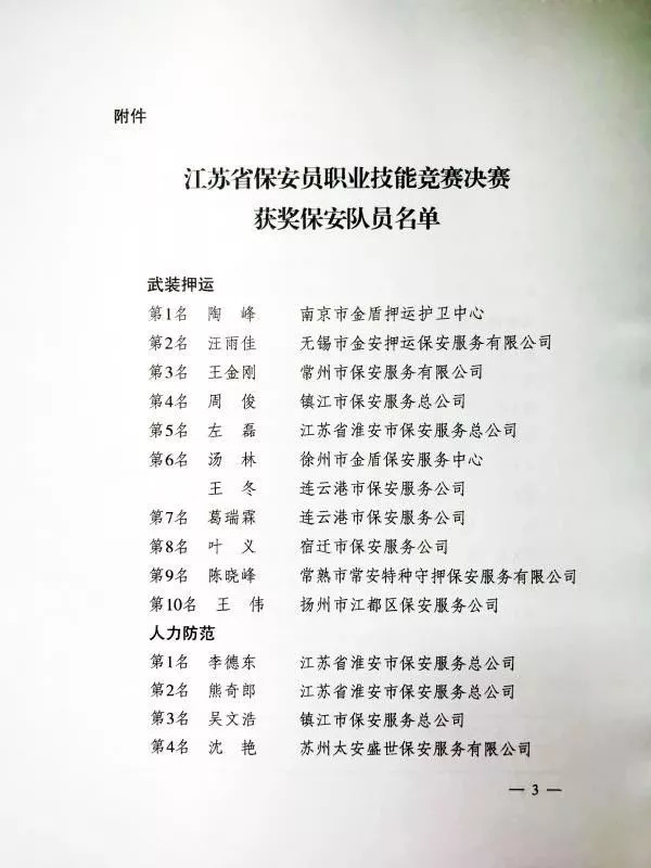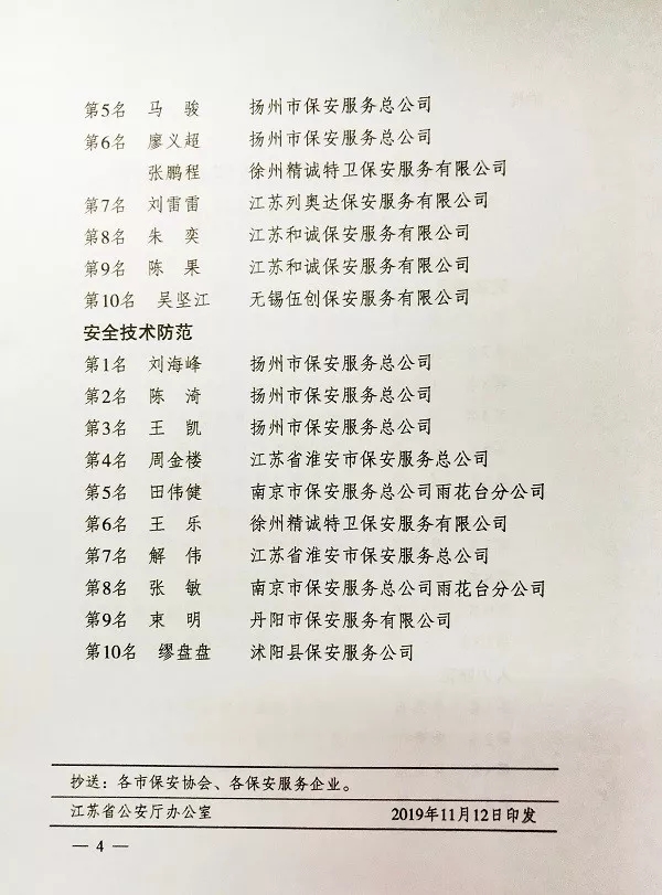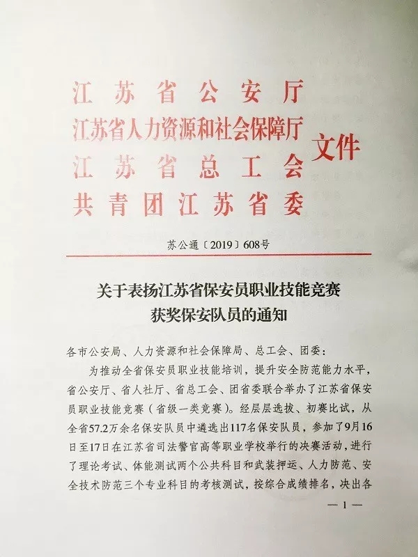 11月12日,江蘇省公安廳、江蘇省人力資源和社會保障廳、江蘇省總工會、共青團(tuán)江蘇省委聯(lián)合發(fā)文,祝賀、表揚獲獎保安員,并對各科目進(jìn)入前六名的獲獎人員分別授予“江蘇省技術(shù)能手”、“江蘇省五一創(chuàng)新能手”和“江蘇省青年崗位能手”榮譽稱號。