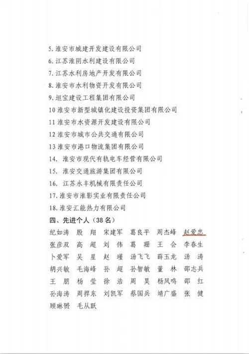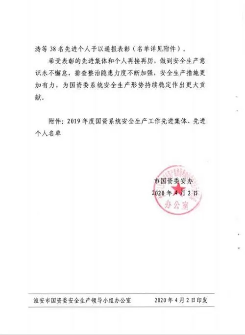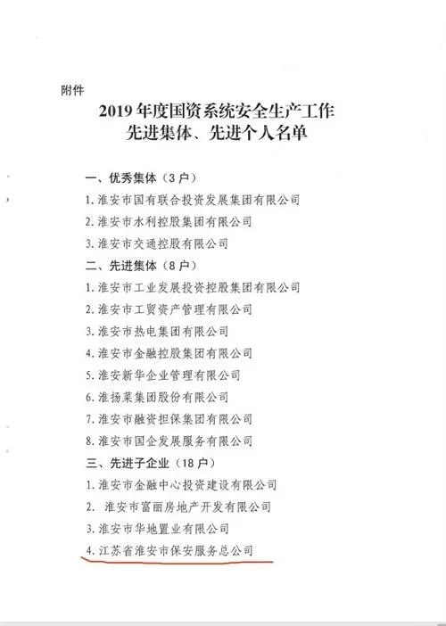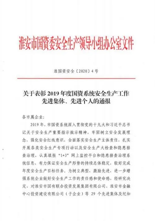 2020年4月2日,淮安市國資委通報(bào)表揚(yáng)2019年度國資系統(tǒng)安全生產(chǎn)先進(jìn)集體和個(gè)人,淮安保安以“零事故”“零隱患”表現(xiàn)榮膺先進(jìn)集體。公司黨總支書記、總經(jīng)理趙愛忠榮膺先進(jìn)個(gè)人。